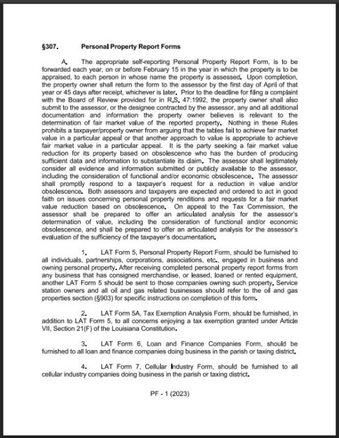 Starting in property tax Year 2026, any taxpayer that renders personal property on a LAT form and wishes to submit any additional documents or materials to an assessor, “shall” submit the new LAT Form VF, or Verification Form. This new form must accompany any documents submitted to the assessor in addition to the LAT and must be signed by a “bona fide” representative of the taxpayer. Under LAC 61:V.307(A)(12), the Commission regulation that puts this new requirement in place, the LAT VF must be signed by an executive or employee with personal knowledge of the information submitted (the Regulation specifically provides that the LAT VF should not be signed by a third-party tax representative). The LAT VF form includes a “verification” as follows: